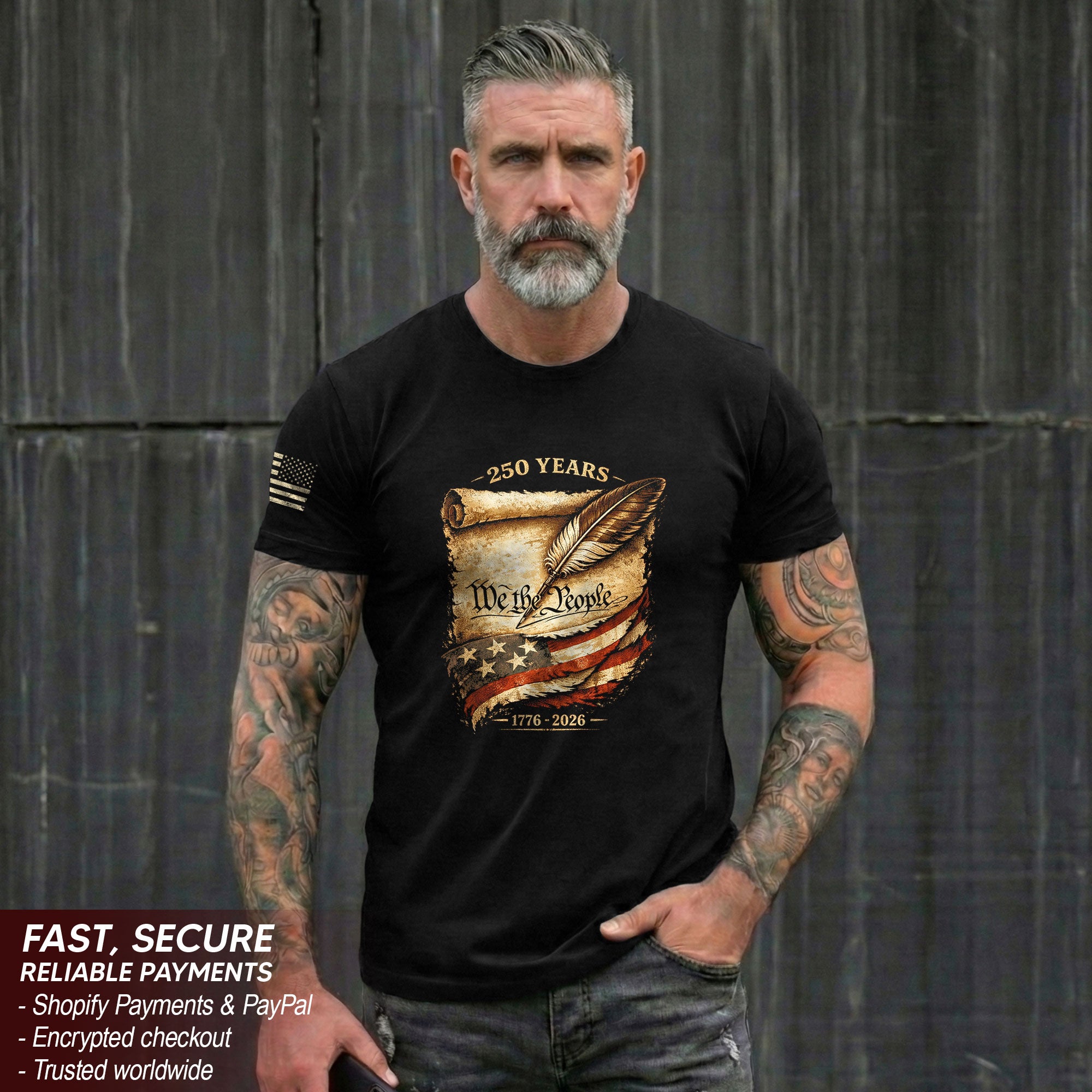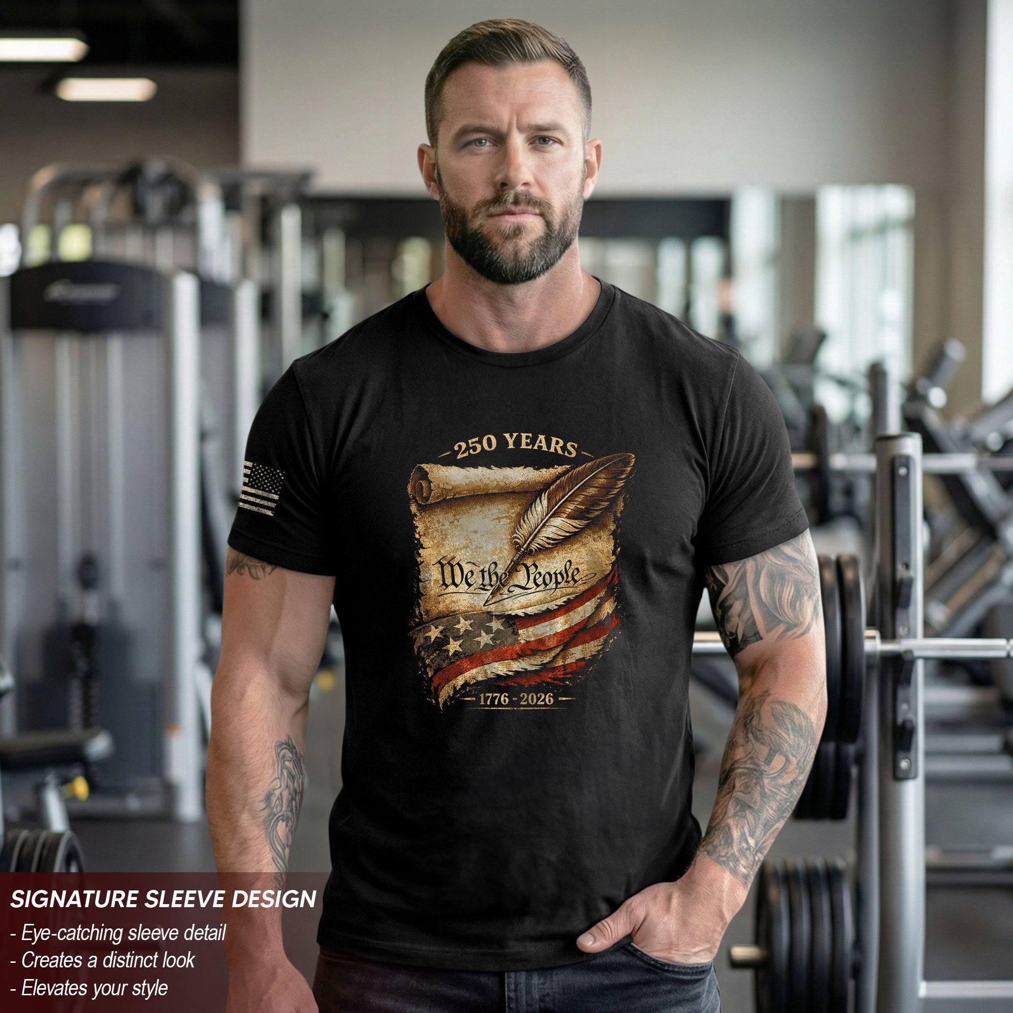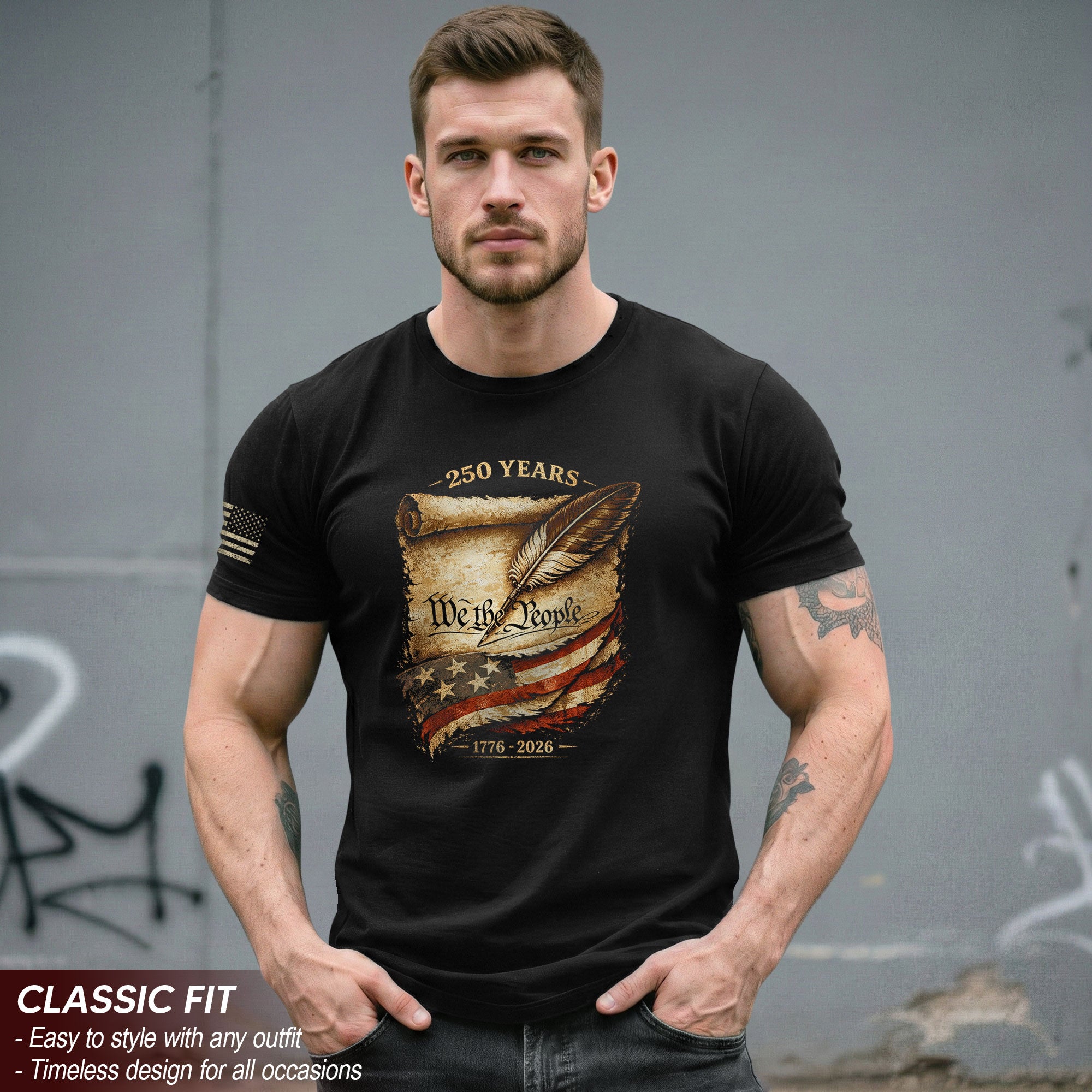 Celebrate America’s 250th anniversary from 1776 to 2026 with this patriotic We The People T-shirt. Featuring the iconic ‘We The People’ script on a vintage parchment background with a classic quill design, this premium tee honors 250 years of independence. Crafted from high-quality, soft cotton for all-day comfort, it’s perfect for patriots, history enthusiasts, and Fourth of July events. Wear it to parades, barbecues, or casual outings to show your American pride. Durable print ensures the design stays vibrant wash after wash. Available in multiple sizes for men, women, and unisex fit. A timeless keepsake for the historic 2026 semiquincentennial milestone.